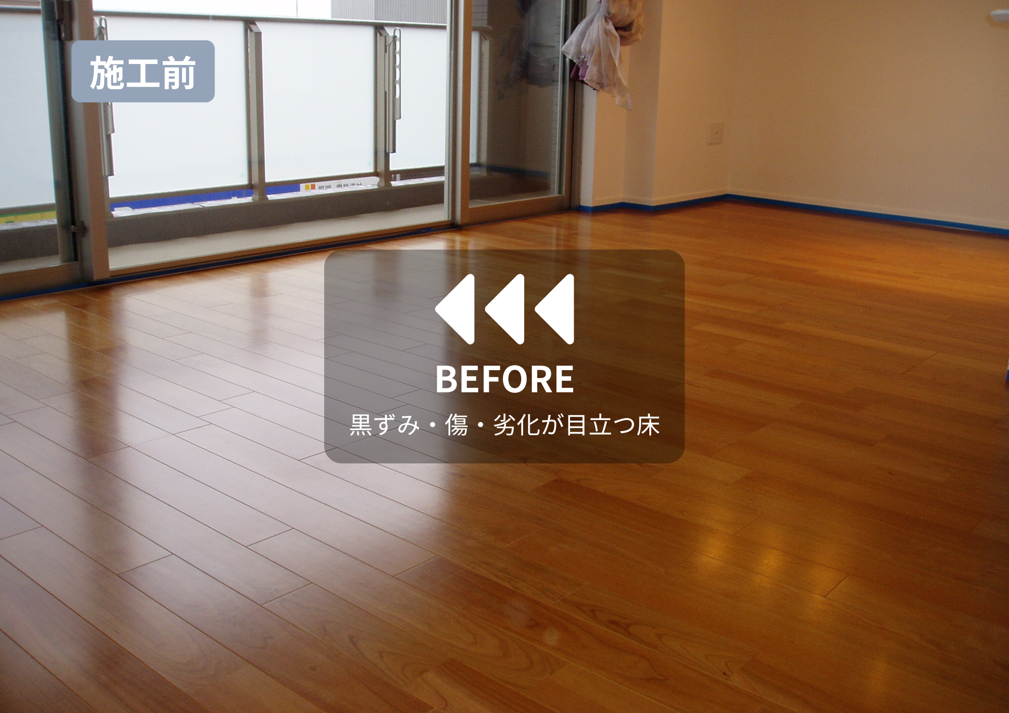 ワックス層に汚れが蓄積し、通行量の多い共用部ほど黒ずみ・ムラが目立ちます。 床材本体も度重なる剥離作業で劣化が進行しやすくなります。